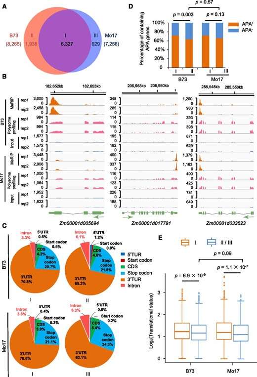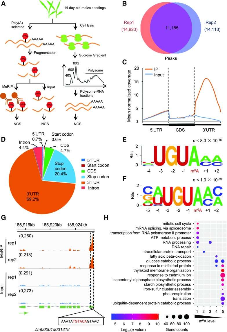 m6A是真核mRNA最丰富的RNA修饰之一。尽管已有大量证据证明m6A能影响RNA在代谢方面的功能,但其对植物翻译效率的转录后平衡的整体贡献程度仍然未知。本研究中,作者对两个玉米(Zea mays)自交系转录组范围内的mRNA m6A分布进行MeRIP-seq和多聚体分析(polysome profiling),以评估m6A修饰与翻译状态的整体相关性。m6A修饰位点广泛分布在数千个蛋白编码基因中,只有一个共有motif,主要在3'UTR区富集,且m6A修饰在调节可变多聚腺苷酸化(APA,alternative polyadenylation)中发挥作用。更重要的是作者鉴定出m6A修饰根据其强度和基因位置显示了与翻译状态的多方面相关性。此外作者在m6A修饰中观察到大量的种内变异,这是一种自然变异,被证明部分由基因特异性表达和可变剪接驱动。总之,这些发现为鉴定玉米中受m6A修饰调控的转录本提供了宝贵的资源,并为更好地理解m6A在介导基因表达调控中的自然变异铺平了道路。
