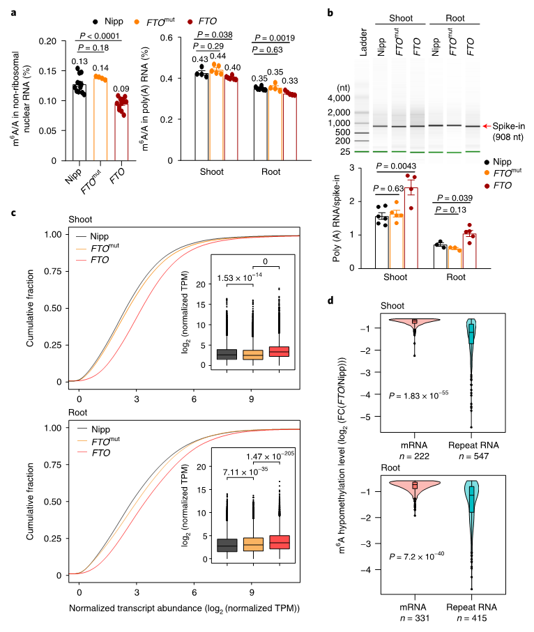 分别从15日龄水培实验的野生型WT(Nipp)、FTO 失活表达(FTOmut)、FTO 表达植物的等量(1g)嫩茎和根中提取分离Poly(A) RNA和加标对照(5pg),并进行m6A-MeRIP测序和转录组RNA-seq。