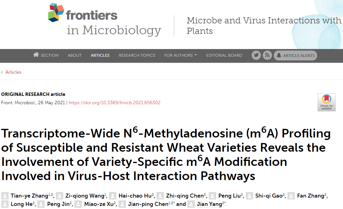 标题:Transcriptome-Wide N6-Methyladenosine (m6A) Profiling of Susceptible and Resistant Wheat Varieties Reveals the Involvement of Variety-Specific m6A Modification Involved in Virus-Host Interaction Pathways(对敏感和抗病小麦品种的m6A全转录组测序分析揭示了病毒-宿主相互作用途径中的品种特异性m6A修饰)