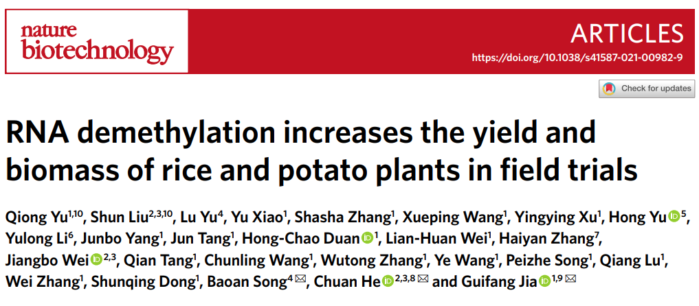 标题:RNA demethylation increases the yield and biomass of rice and potato plants in field trials (RNA去甲基化可以提高水稻和马铃薯的产量和生物量)