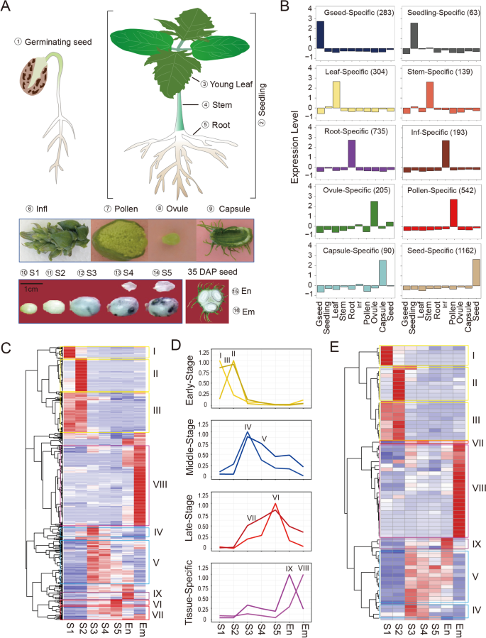 (1)通过RNA-seq基因表达分析生成一个涵盖植物整个生命周期的16个代表性组织的基因表达图谱,并在蓖麻中鉴定出1162个种子特异性表达基因,主要参与胚乳细胞化、胚发育和物质累积以及种子脱水成熟等过程。这是双子叶植物种子生物学研究的一个有价值的模型。