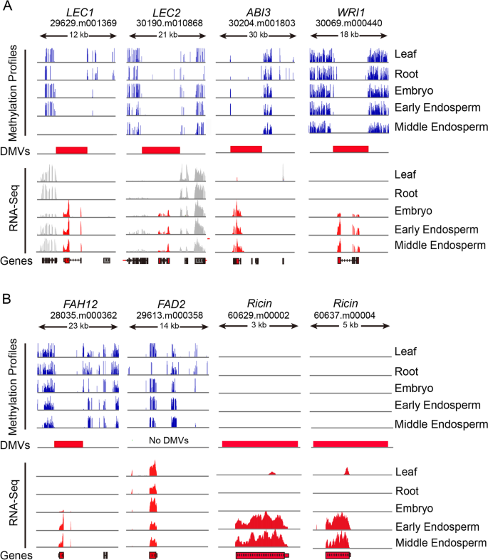 (3)转录组和DNA甲基化组的关联分析,结果发现DMV具有激活转录的潜力,尤其是组织特异性基因的转录。大部分种子特异性基因(66%)都位于基因组DMV中,其中包括调控种子/胚乳发育和物质累积的关键转录因子(如AGL61、AGL62、LEC1、LEC2、ABI3和WRI1)以及多个油脂合成关键基因(特别是参与蓖麻油酸合成的关键酶基因 FAH12 )。
