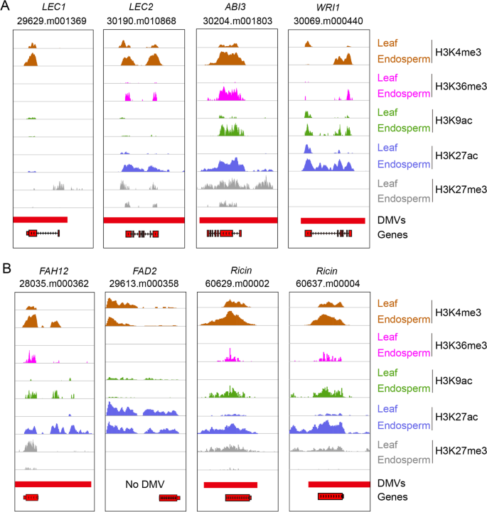 图5:叶片和胚乳关键特异基因的组蛋白修饰图谱