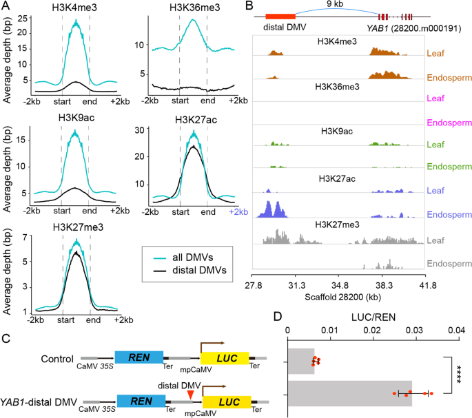 远端DMV及其最近端基因YABBY1(YAB1,上)及叶片和胚乳不同组蛋白修饰(下)