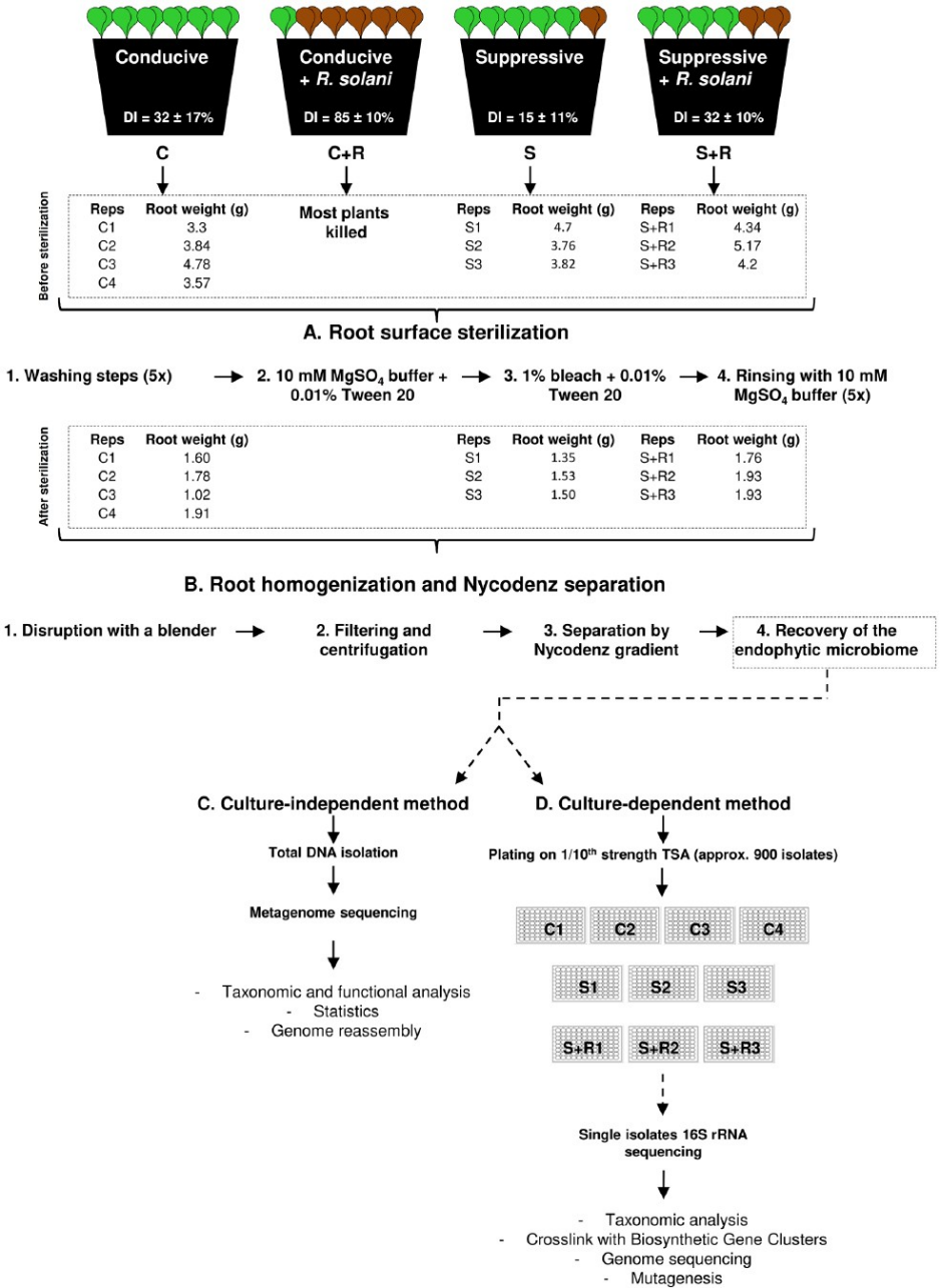 作者设置甜菜种植在感病(Conducive, C)和抑病 (Suppressive, S) 土壤和是否接种病原菌R.solani(R)共计四个处理(C、C+R、S、S+R)。在抑病土壤中接种病原菌(S+R)的甜菜发病率为15-30%,在感病土壤中接种病原菌(C+R)的甜菜发病率为80%。