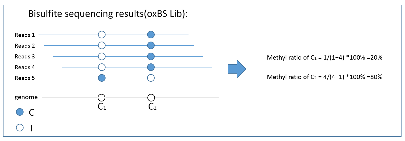 甲基化水平可根据未转化为 T 的 C 与转化为 T 的 C 的 reads 的比例计算得到,即: