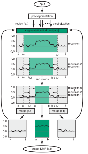 DMR检测使用权威期刊发表的metilene软件。该软件先将基因组进行预分段,以排除较长序列中不包含CG位点的片段。随后,利用二元分隔算法,递归缩小检测范围,以搜索得到组间累积平均甲基化差异最大的区域,作为可能的DMR;最后,结合双重统计学检验(MWU-test和2D KS-test),得到准确的DMR。检测原理如下图所示: