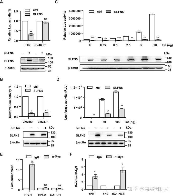 图4:SLFN5通过N-末端结构域特异性结合LTR来抑制基础转录和Tat反式激活HIV-1转录