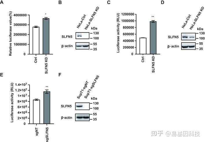 为了解SLFN5的潜在抗病毒活性,作者用HIV-1 DNA NL4-3luc.RE-和 VSV-G 以及表达 SLFN5 的载体或对照载体 (pcDNA4) 转染HEK293T细胞。通过感染SupT1细胞,然后检测荧光素酶活性来确定培养上清液中 VSVG psedotyped NL4-3luc.RE 衍生病毒 (HIVNL4-3luc ) 的水平。