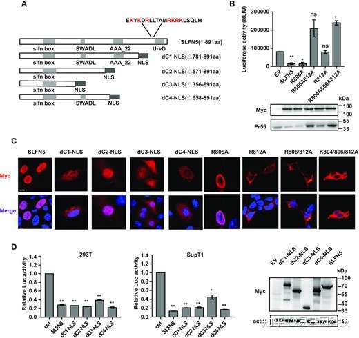 为定义SLFN5抗HIV-1活性的结构域,作者在N端和C端构建了7个SLFN5编码序列片段,分别命名为SLFN5-dC1(1-780aa),SLFN5-dC2(1-570aa),SLFN5-dC3(1-335aa),SLFN5-dN1(150-891aa),SLFN5-dN2(335-891aa),SLFN5-dN3(450-891aa)和SLFN5-dN4(660-891aa)。结果没有一个构建体显示出用野生型SLFN5观察到的抗HIV-1活性。于是作者鉴定了SLFN5的抗病毒活性是否需要核定位序列,证明了核定位序列在SLFN5抑制HIV-1中的重要性。