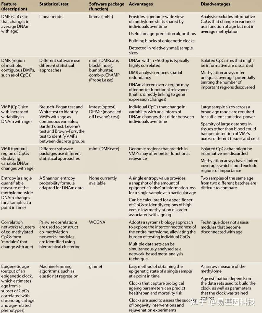 表1. 用于分析 DNAm与年龄相关变化的统计测试和软件