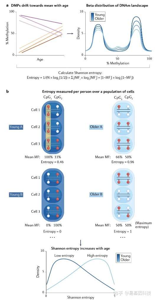 虽然DNAm本质上是二元的,但特定CpG位点的DNAm通常是在一组细胞上测量的,并以梯度(从0到100%)表示。在哺乳动物基因组中,CpG位点通常高度甲基化或未甲基化,很少有中等水平的甲基化位点。然而,在许多CpG位点,甲基化水平随着时间的推移会发生变化,其中个别CpG位点(即DMP和VMP)的微小变化累积导致年轻的DNAm模式无法在整个生命周期中保持。这种现象被描述为“‘epigenetic chaos”,也就是信息的丢失,会随着年龄的增长而增加。