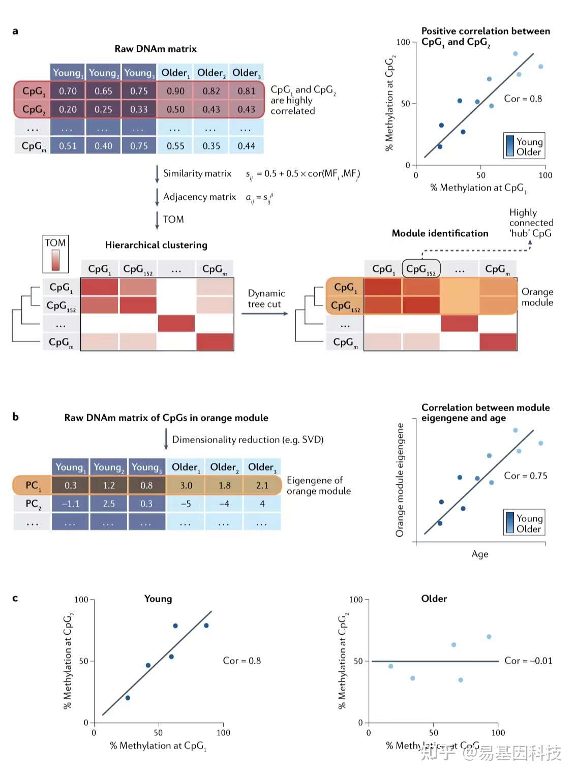 因此,DNAm分析可能受益于采用一种涵盖整个甲基组相互关联的“系统生物学”方法。加权相关网络分析 (WGCNA),已被用于识别与人类衰老相关的共甲基化CpG位点簇,无论是在单个组织中,如唾液,还是跨组织,如脑和血液。WGCNA通过测量CpG位点之间的成对相关性来构建共甲基化网络(图3)。然后将这种相关性转换为邻近性度量(即网络互连)(表1)。