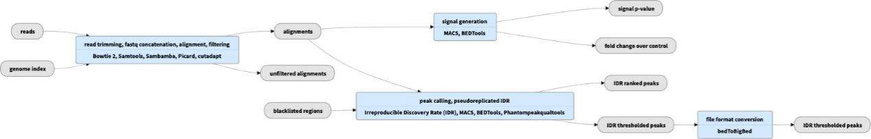 ChIP-seq是一种用于分析蛋白质与DNA互作的方法。ChIP-seq将染色质免疫沉淀与DNA高通量测序相结合,以推断DNA相关蛋白的可能结合位点。ENCODE Consortium开发了两个分析pipeline来研究两种不同类别的蛋白质-染色质互作(组蛋白ChIP-seq和转录因子ChIP-seq)。组蛋白ChIP-seq的pipeline适用于与较长区域或结构域上的DNA相关蛋白质。典型的靶点是组蛋白或特定的翻译后组蛋白修饰。