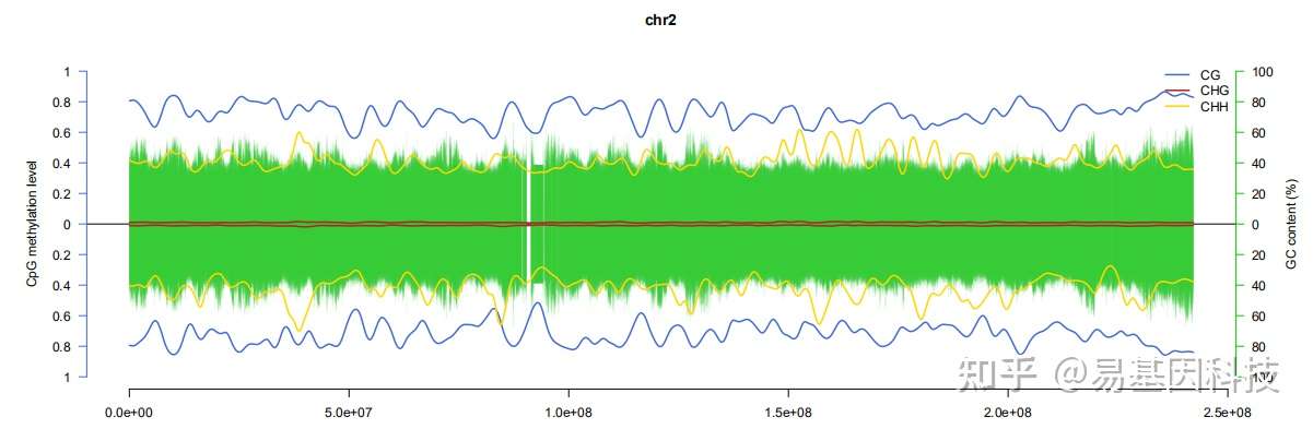 从染色体水平来描述甲基化 C 碱基的的分布情况(仅>50M 的序列)。绿色细线表示以 10kb 的窗口统计甲基化 C 碱基的密度在染色体上的分布情况,光滑曲线则表示不同类型甲基化C 碱基( CG、CHG 和 CHH )的密度分布。