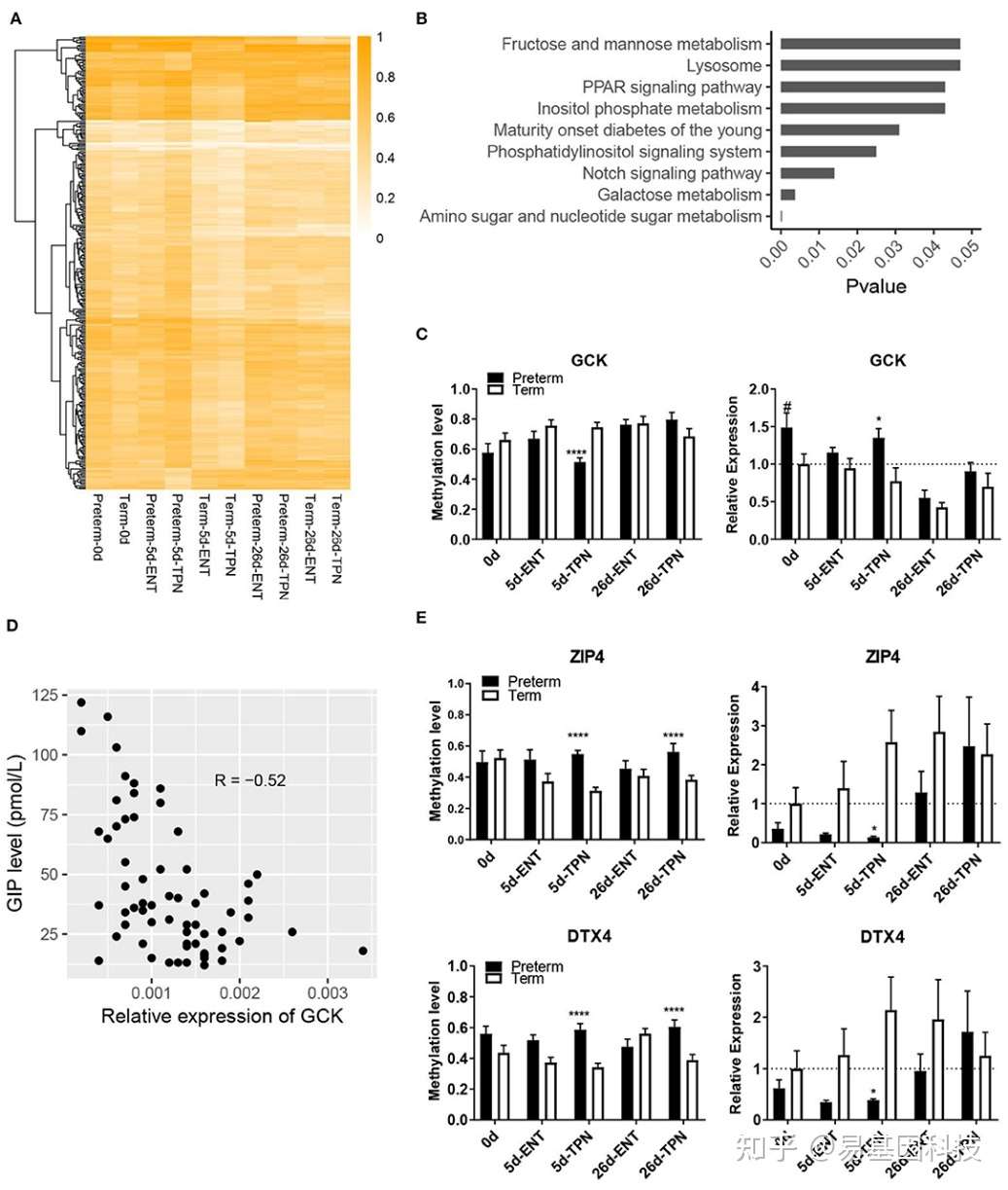 早产后,未成熟的肠道功能和免疫功能必须迅速适应细菌定植和肠内喂养。作者为验证肠道表观遗传变化与早产及首次喂养时的肠道反应有关,以仔猪为模型,对早产猪和足月猪进行全肠外营养(TPN)或部分肠内喂养5天,然后用牛奶进行纯肠内喂养,直到第26天(断奶年龄)。比较分析早产猪和足月猪在第0天、第5天和第26天的肠道结构、功能、微生物组、DNA甲基组和基因表达(每组n=8)。RRBS结果显示,出生时早产猪肠道出现绒毛萎缩和整体高甲基化,影响与Wnt信号通路相关的基因。在生命的前5天,高甲基化相关的LBP(lipopolysaccharide binding protein)和TLR4(Toll-like receptor 4)通路基因表达明显降低,但大多数早期甲基化差异在第26天消失。直到第26天,早产猪的蔗糖酶和麦芽糖酶活性仍然降低,肠道微生物群发生改变。0-5天期间显示许多新的甲基化差异,主要表现在未提供肠内喂养(TPN喂养)的情况下。这些甲基化差异影响了与细胞代谢相关的肠道基因,包括通过启动子低甲基化增加GCK(葡萄糖激酶)表达。总之,未成熟肠道在早产后可迅速适应其基因甲基化和表达的能力,只有少数早产相关缺陷会持续到断奶。结果表明早期肠内喂养对于刺激肠道基因的甲基化重编程可能很重要,从而使肠道快速适应早产环境。