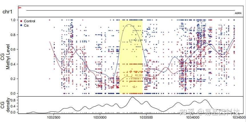 由于DMR 数量太多,筛选 Q-value top20 的差异甲基化区域进行可视化绘图。下图为例,黄色部分为 DMR 区域。横坐标以绘出以 DMR 区域为中心向两侧各扩展 1kb 区域的甲基化情况。最上方黑色方框标识出该区域内基因 promoter 区的位置(如果有)和基因表达方向。中间部分是两组样本的甲基化水平变化曲线。最下方是 CG 位点密度曲线。