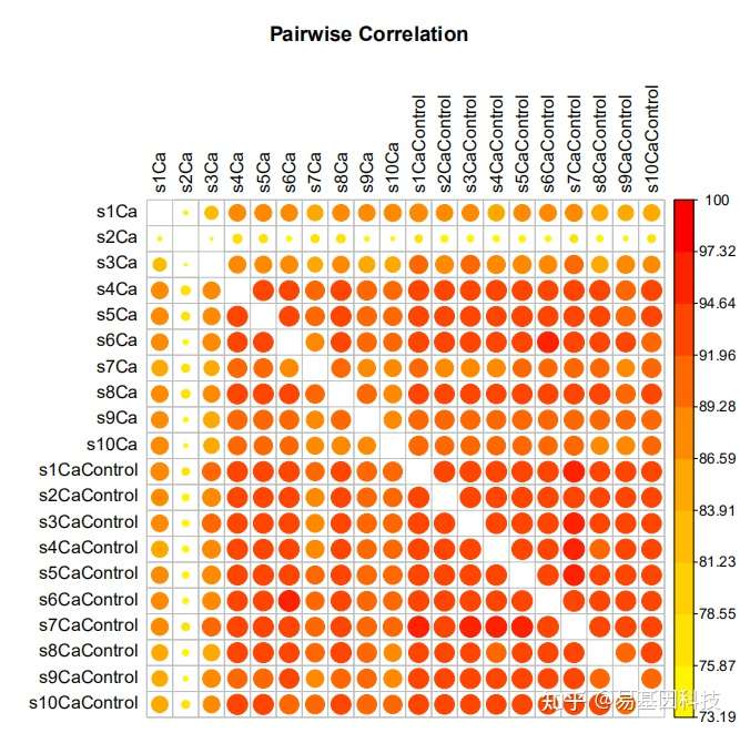 下图示例反映了样本之间 CpG 甲基化率的相关性,圆面积越大,颜色越深相关性越高。