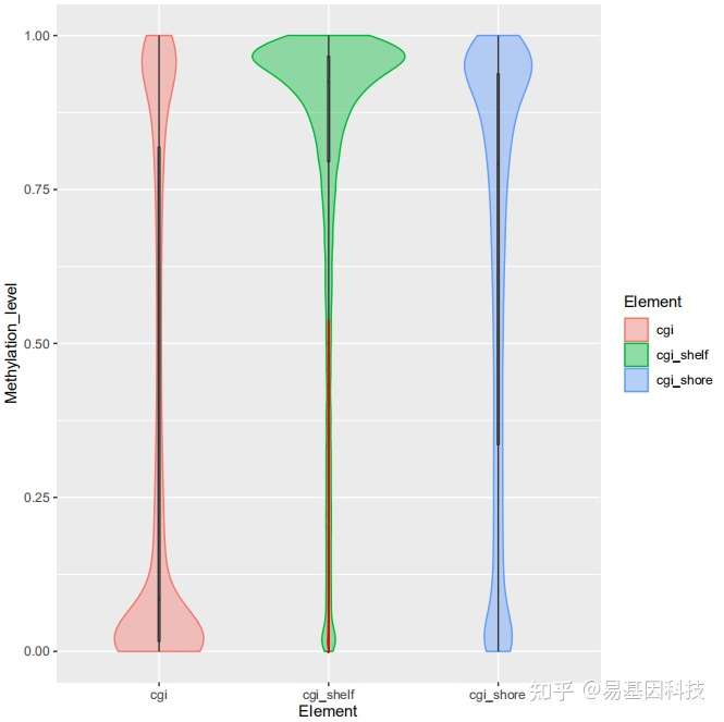 以下图为示例,反映了样本在 CpG island,CpG island shore(CpG island上下游2kb区域)和 CpG island shelf(CpG island 上下游 2000pb 至 4000bp)区域的甲基化水平分布情况。可以看出 CpG island 区域的甲基化水平整体较低,而 CpG island shore 的甲基化水平分布较均匀,更远离CpG island的CpG island shelf甲基化水平最高。