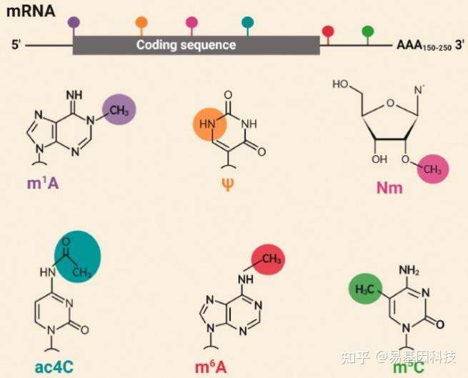 图1:mRNA常见的表观转录组修饰。Mature RNA有 172种化学修饰;其中72个是甲基化修饰变体。研究最多的表观转录组修饰有N6-甲基腺苷(m6A)、假尿苷(ψ)、5-甲基胞苷(m5C)、N1-甲基腺苷(m1A),核糖2'-O-甲基化(Nm)和N4-乙酰胞苷(ac4C)。