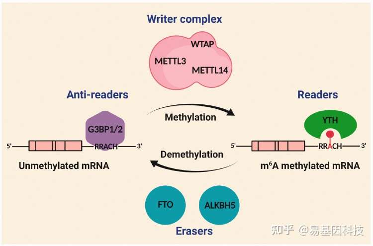 m6A甲基化由m6A甲基化转移酶(m6A writers)、m6A去甲基化酶(m6A erasers)、m6A识别蛋白(m6A readers)调控,其中,m6A readers和反readers(Anti-readers)决定m6A修饰转录本的命运。