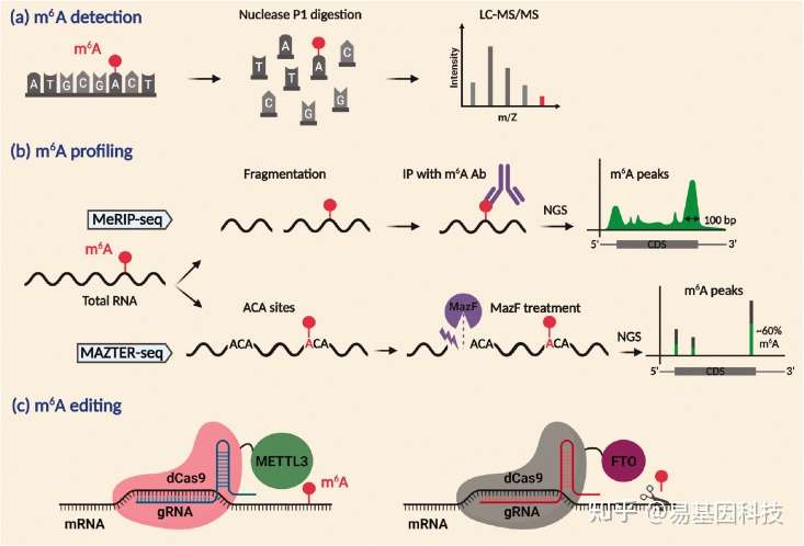 图3:m6A甲基化研究技术。LC-MS/MS可定量m6A修饰(a)。MeRIP-seq可鉴定转录组范围内的m6A图谱。MAZTER-seq通过单核苷酸分辨率显示m6A位点及甲基化的化学计量(b)。METTL3或FTO融合到序列特异性gRNA靶向m6A位点附近非活性dCas9的CRISPR/Cas9基因编辑可以调节位点特异性m6A甲基化(c)。