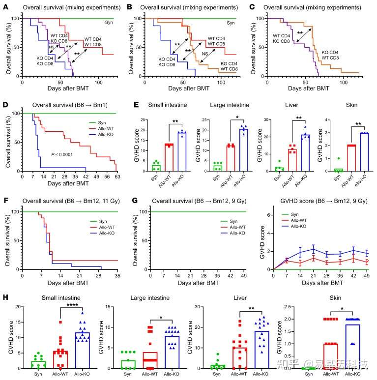 (A-C)混合实验中的生存率,WT和KO 中的CD4+和CD8+ T细胞分别分离并以2:1的CD4/CD8比例以各种组合共注射。每组2个重复,Syn/WT/KO 各n=8,混合组n=16。