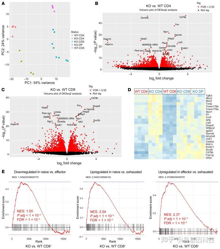 (E) MSigDB C7数据库KO和WT CD8+ T细胞过表达的免疫相关基因代表性GSEA富集图。Adj,调整。