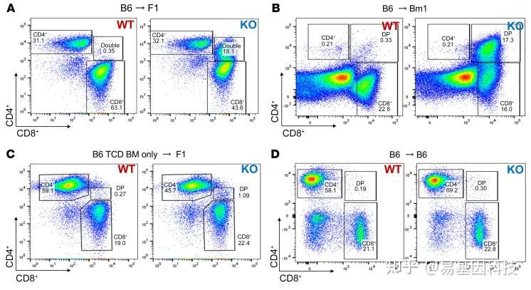 B6→F1模型的平行实验,小鼠在第7天和第14天被处死。通过多色流式细胞术分析脾脏和淋巴结的单细胞悬液,鉴定出一个明显的CD4+ CD8+双阳性(DP)细胞群。该细胞群在Dnmt3a-KO T细胞的受体中显著扩增。