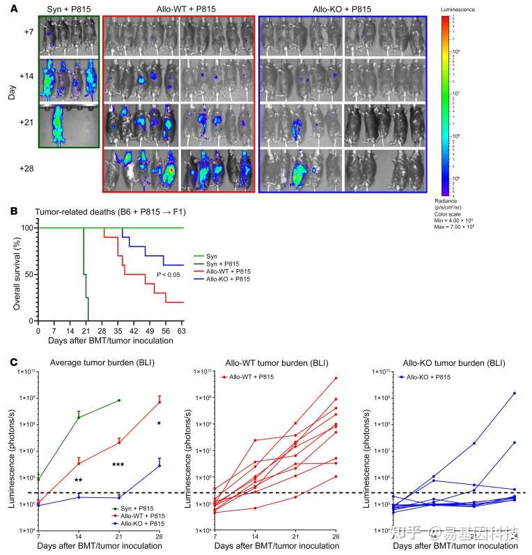 B6→F1模型第0天将P815肿瘤细胞(每只小鼠500个细胞)添加到接种体中,通过BLI监测肿瘤负荷。(A) BLI图像。
