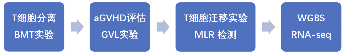 实验:同种异体血液或骨髓移植 (BMT)实验、急性移植物抗宿主病(aGVHD)评估、移植物抗白血病(GVL)实验、T细胞迁移实验、MLR检测、WGBS测序分析、RNA-seq测序分析