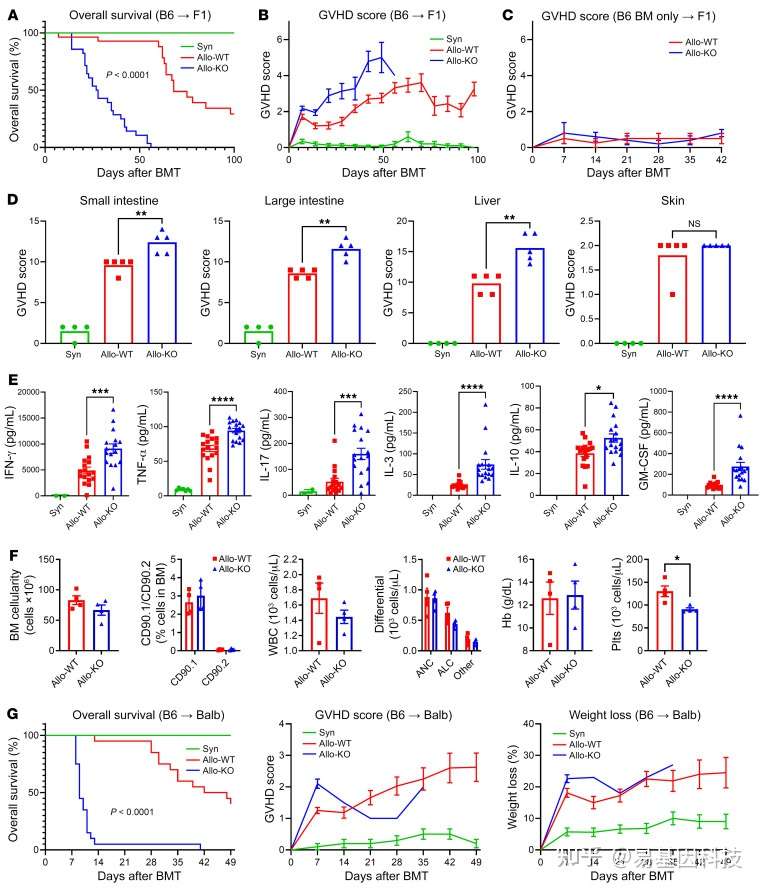为确定供体T细胞Dnmt3a基因缺失对同种异体反应性的影响,作者使用已建立的单倍体模型 B6(H-2b)和F1(H-2bxd)小鼠分别作为BMT供体和受体。从生存率和临床评分来看,与接受来自WT供体的allo-BMT小鼠相比,B6 Dnmt3a-KO供体的小鼠表现出更严重的全身性aGVHD。而同基因BMT受体没有发生GVHD,且最终与非移植对照无法区分。仅接受T细胞耗竭的WT或KO BM的小鼠也不会发生GVHD。与同种异体对照相比,Dnmt3a- KO供体进行BMT后观察到严重的全身性GVHD与肠道(小肠和大肠)和肝脏的组织病理学评分增加相关。在BMT后第7天,发现KO受体血清中的促炎细胞因子(包括IFN-γ,TNF-α,GM-CSF,IL-17,IL-3和IL-10)显著增加,且KO受体表现出强大的BM植入和供体来源的造血功能。为确保不是应变依赖现象,在MHC系统(B6→BALB/cJ)模型中进行了类似的BMT实验,验证了与WT对照供体相比,DNMT3a-KO的GVHD严重程度显著增加。