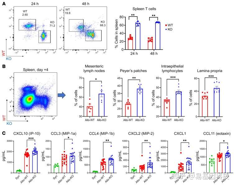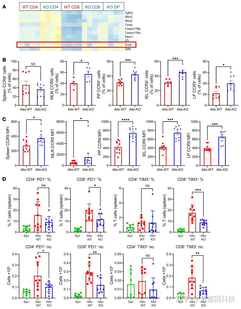 (B) 第4天通过CD45.1/2和CD90.1/2之间的等位基因差异区分WT和KO群。每组2个重复,每组n=8(除MLN n=5)。