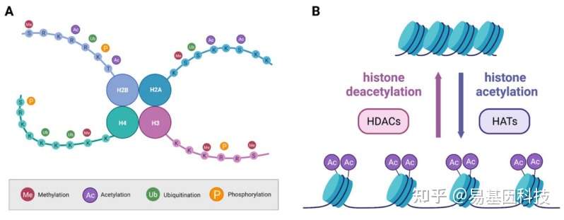 组蛋白在其突出的N-尾上经历过多的PTM(图2A)可逆修饰,其状态由具有拮抗功能的酶调控,这些酶将添加(writers)或敲除(erasers)修饰。PTM影响组蛋白与DNA和其他蛋白互作,从而促进或抑制转录。甲基化和乙酰化是组蛋白最常见的PTM。