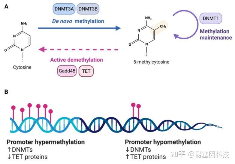甲基(CH3)基团与DNA的共价加成发生在甲基供体S-腺苷甲硫氨酸(SAM)的嘧啶环5′碳位胞嘧啶上。受影响的胞嘧啶主要位于CpG岛,至少200bp的DNA区域位于基因启动子周围。