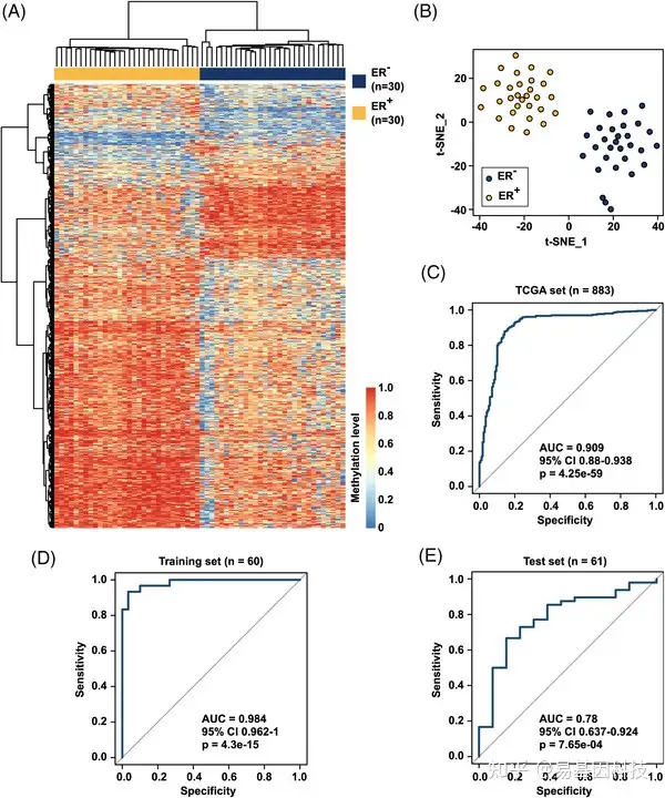 - 癌症基因组图谱(TCGA)450K数据对1332个DMR进行外部验证。1332个DMR中的47个在TCGA数据中是可重复的,ROC曲线表明ER+和ER-乳腺癌样本中显示出良好的区分能力