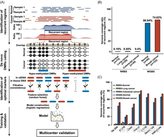 本研究纳入中国两家医院的三组乳腺癌(breast cancer,BC)患者(BC组n=123;健康对照组n=40)。利用ctDNA全基因组重亚硫酸盐测序技术,ctDNA-WGBS具有从200μL血浆中微量ctDNA捕获、微量input(1ng)文库制备、无偏倚的全基因组覆盖和全面计算方法的技术优势。