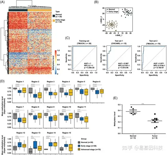图4: 乳腺癌早筛:ctDNA差异甲基化区域(DMR)早期检测乳腺癌。