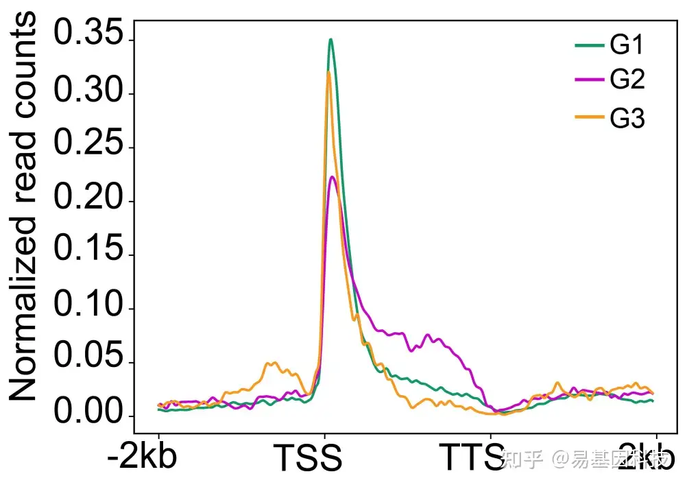 图9:H3K4me3在G1、G2和G3基因从TSSs到TTSs的±2kb范围内富集程度