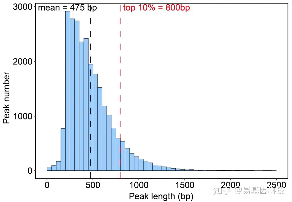 黑色虚线代表所有peaks平均长度,红色虚线代表较宽H3K4me3 peak阈值