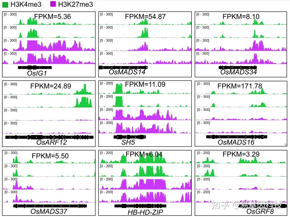 图:水稻雄性减数分裂细胞的H3K4me3和H3K27me3表征。