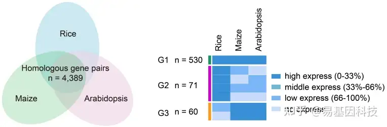 (右)三种不同亚型的同源基因,G1(n=530)在三种物种中高表达的基因,G2(n=71)仅在水稻中高表达的基因和G3(n=60)在拟南芥和玉米高表达的基因