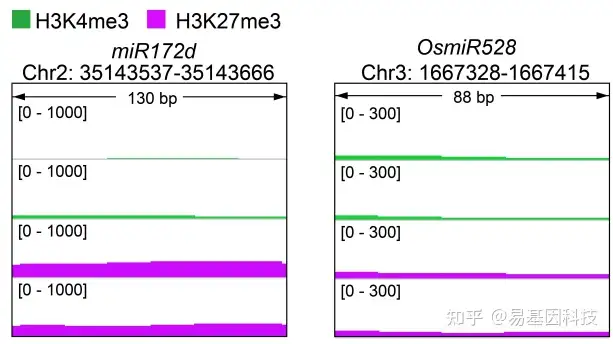 图7:miR172d和OsmiR528中H3K4me3和H3K27me3丰度IGV图