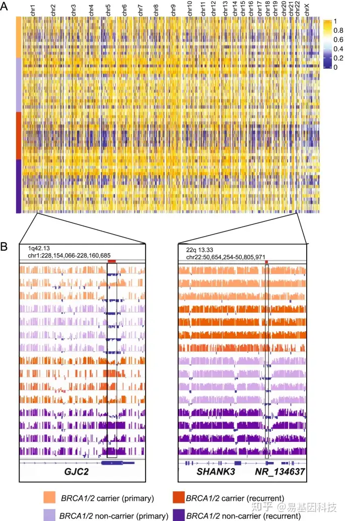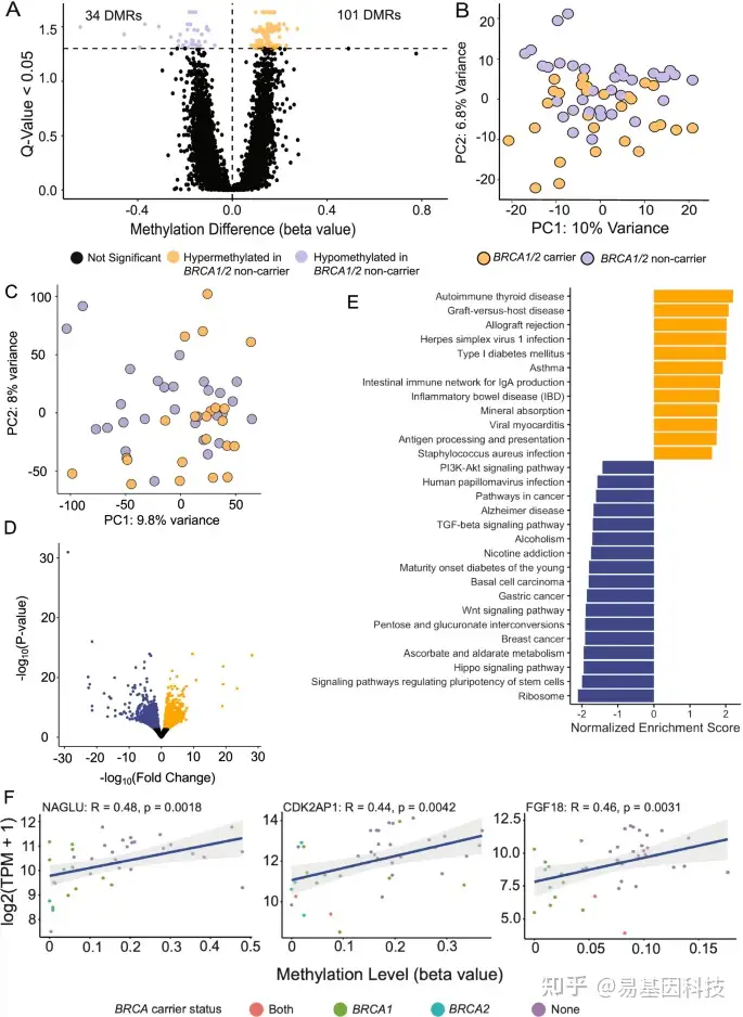 - BRCA1/2突变肿瘤中鉴定出135个差异甲基化区域(DMR),而BRCA1/2非携带者肿瘤中有高甲基化趋势;BRCA1/2非携带者肿瘤中有101个区域高甲基化,而BRCA1/2突变肿瘤中只有34个区域高甲基化;