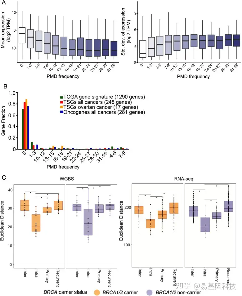 - 与PMD外的基因相比,多个肿瘤标本共有PMD内的基因低表达(左),但表达变化较大(右);