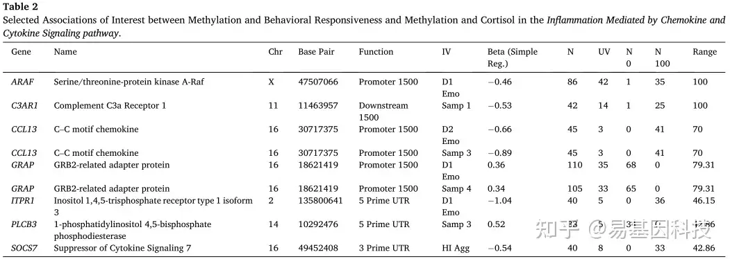 表2:由趋化因子和细胞因子信号通路介导的炎症中甲基化和行为反应以及甲基化和皮质醇之间选定的感兴趣的关联。