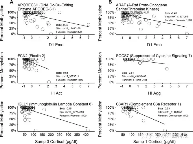 图5:特定目标候选基因的原始数据。该图显示了四个候选基因的原始数据,其中甲基化与行为反应或皮质醇显著相关。β值表示所示自变量和因变量之间关联的简单回归β权重。