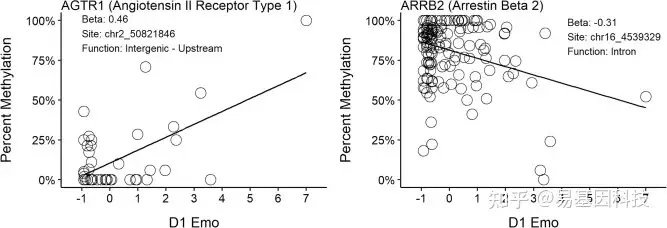 图4:第1天情绪与通过血管紧张素II 刺激G蛋白和β-抑制蛋白通路的信号传导中两个选定位点甲基化之间的关联原始数据。其中甲基化与第1天情绪相关。β值表示所示自变量和因变量之间关联的简单回归β权重。缩写:D1-Emo第1天情绪。