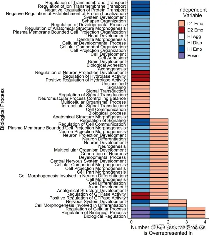 图3:显著过表达的PANTHER生物过程。该图显示了在所分析的自变量中显著过表达的PANTHER生物学通路(FDR q<0.05)。缩写:D1 Emo和D2 Emo表示第1天和第2天情绪;HI Agg表示人类入侵者攻击;HI-Disp表示人类入侵者迁移;HI Emo表示人类入侵者情绪;Eosin表示嗜酸性粒细胞计数。