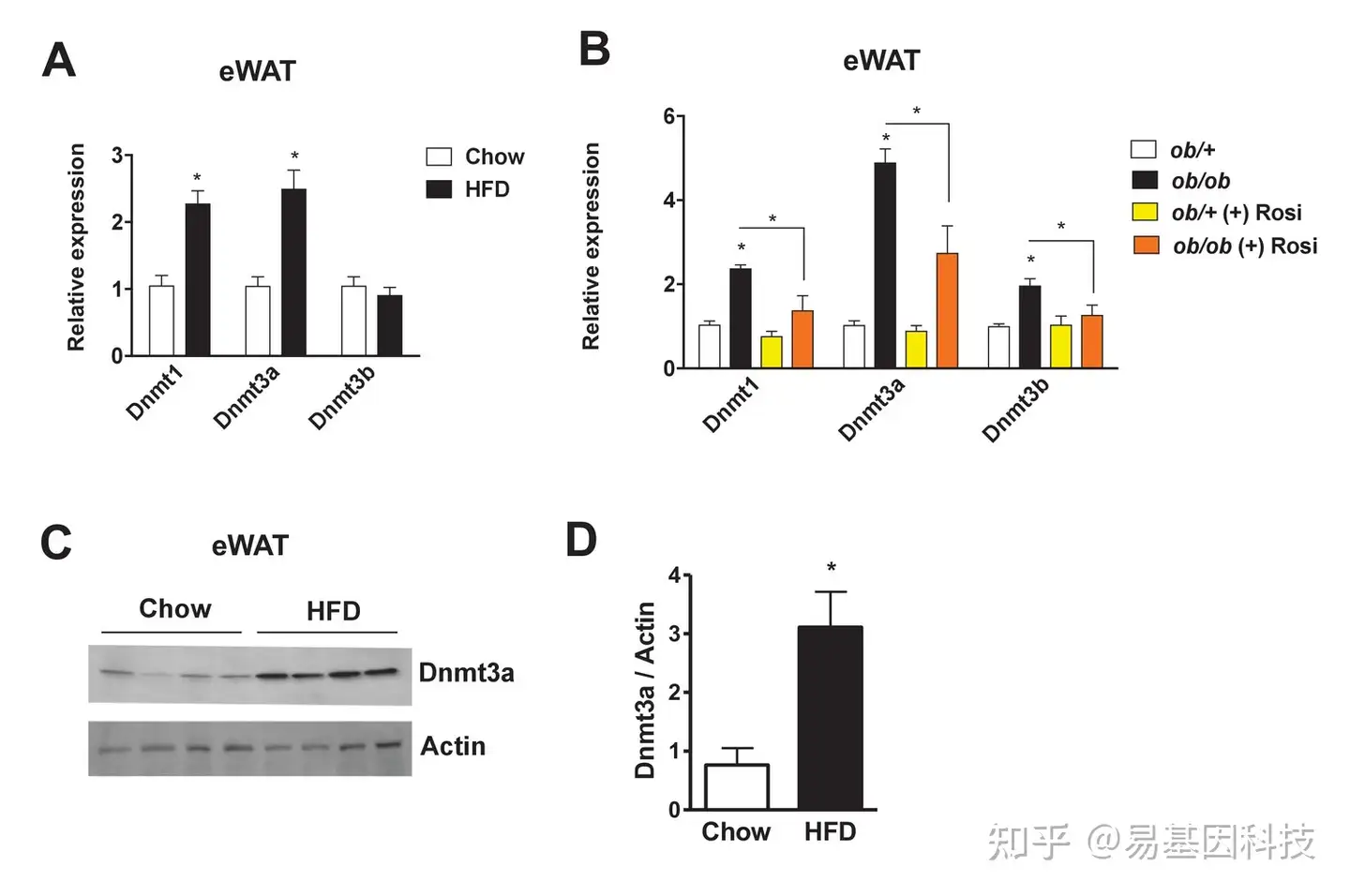 e.g. 高脂饮食组和肥胖人群中均观察到DNMT的RNA和蛋白质表达上调